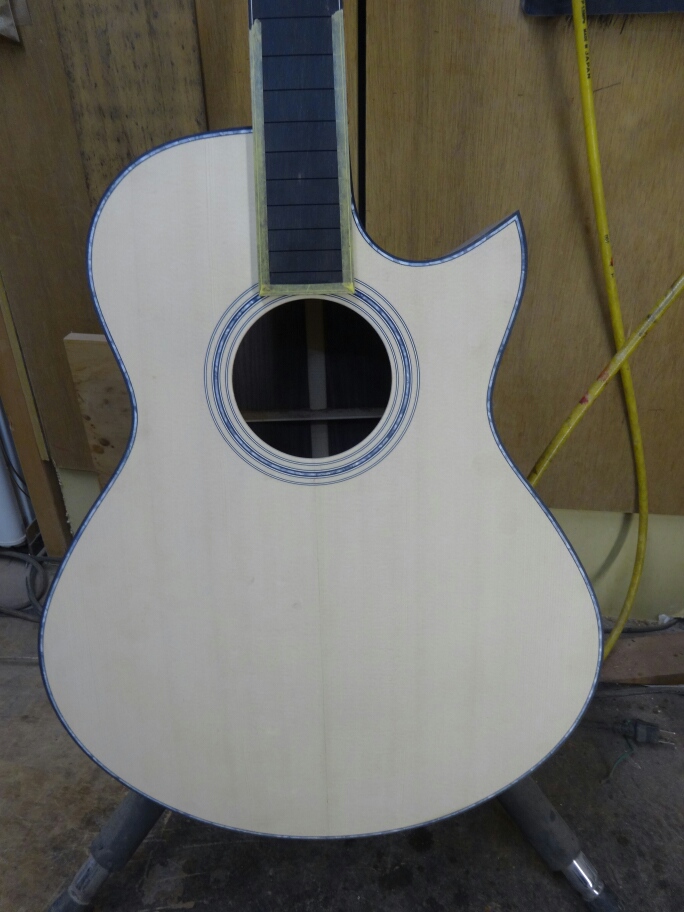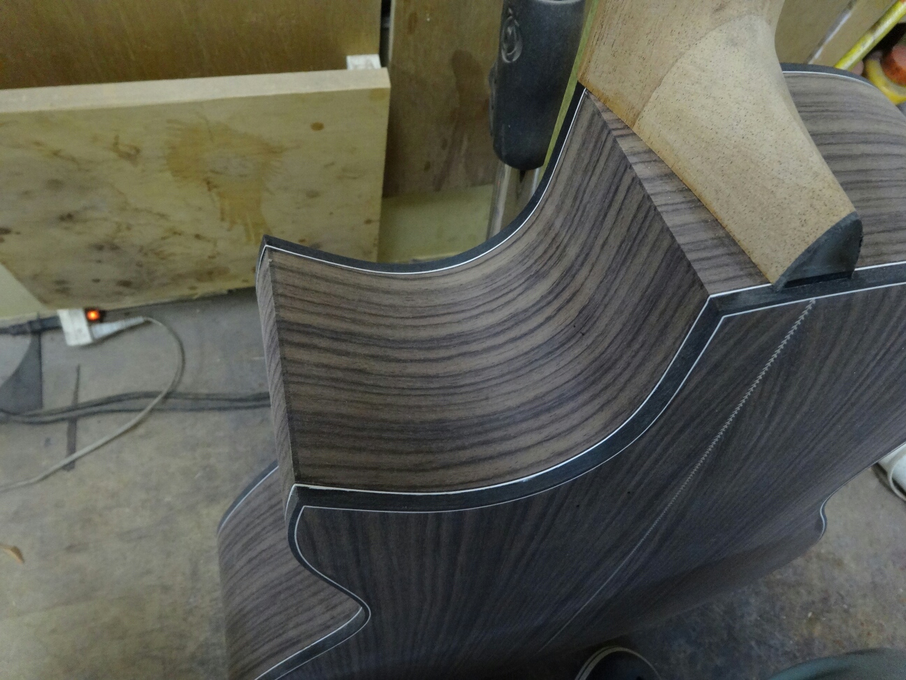 バックのローズ、柾目なんですがほんの少し杢目の曲った部分を使ってボディ上部に向けて尖らせてみました。