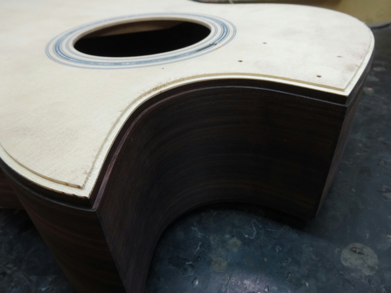 写真の様に段階で彫る事で接着面の面積を拡げ、パーフリング、バインディングを組み合わせて接着する事により強度のアップを狙っています。