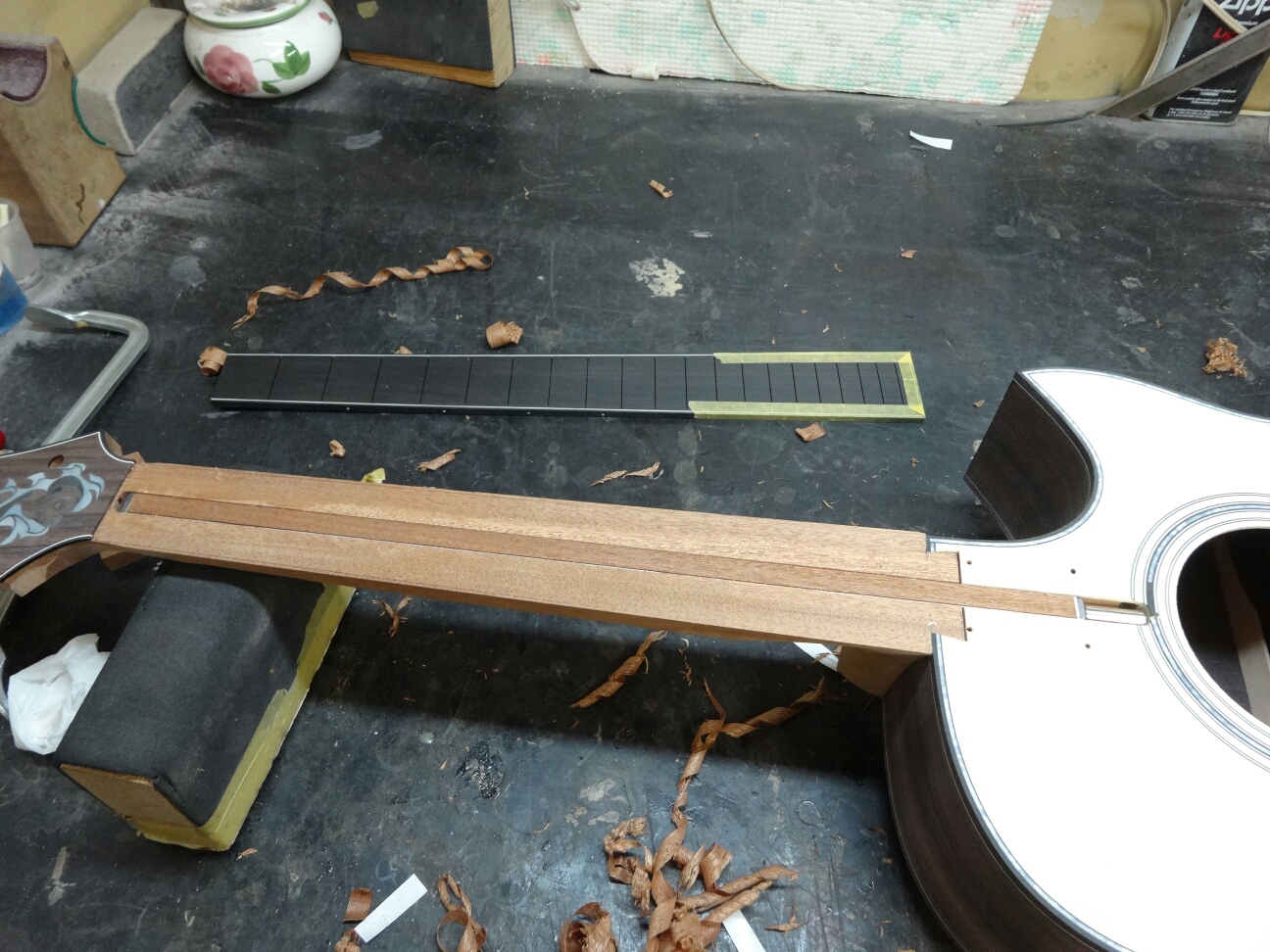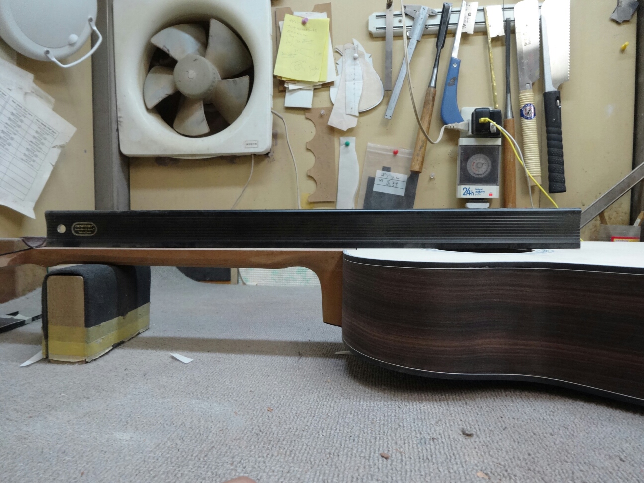 ここをキッチリ仕上げておくとストレートに作った指板をストレートに接着するだけ。