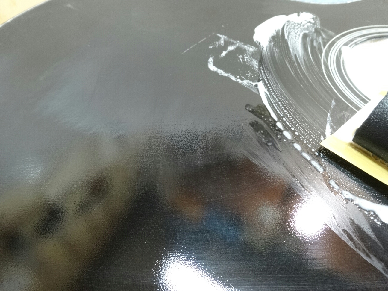 こびり付いたラッカーが塗膜のラッカーを巻き込み大きな傷を作ることを防ぐために潤滑の為の石鹸を使いながら研磨します。