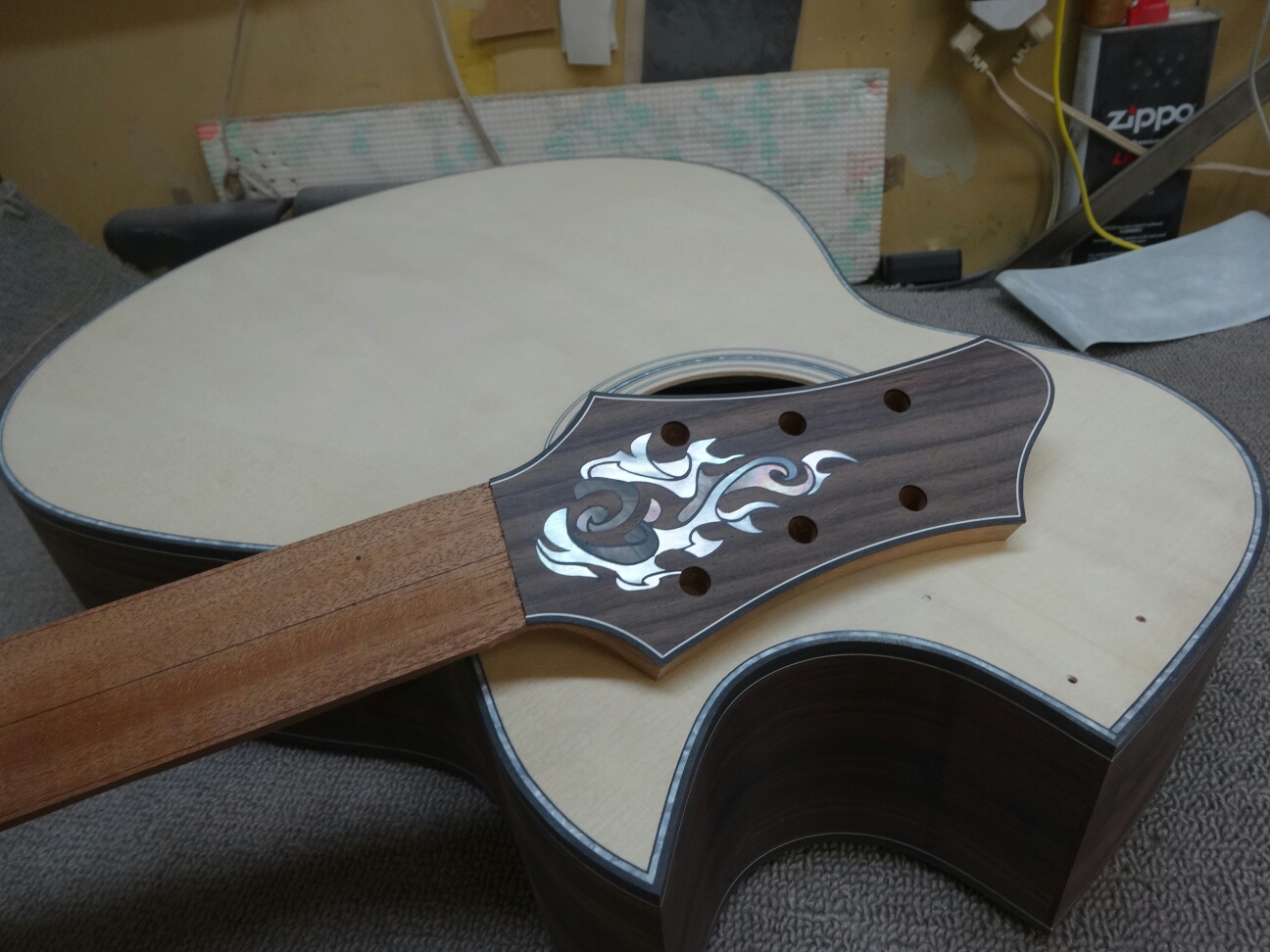 これも指板サイドにセルを使うので寝かしの事まで考え、先行してやっていきます。