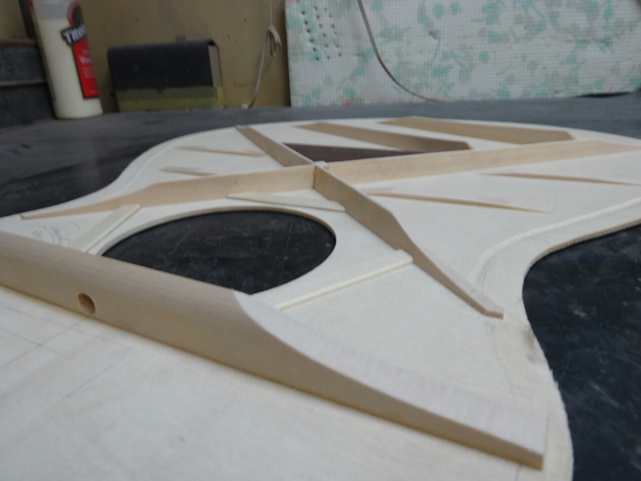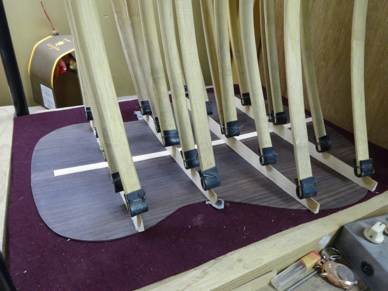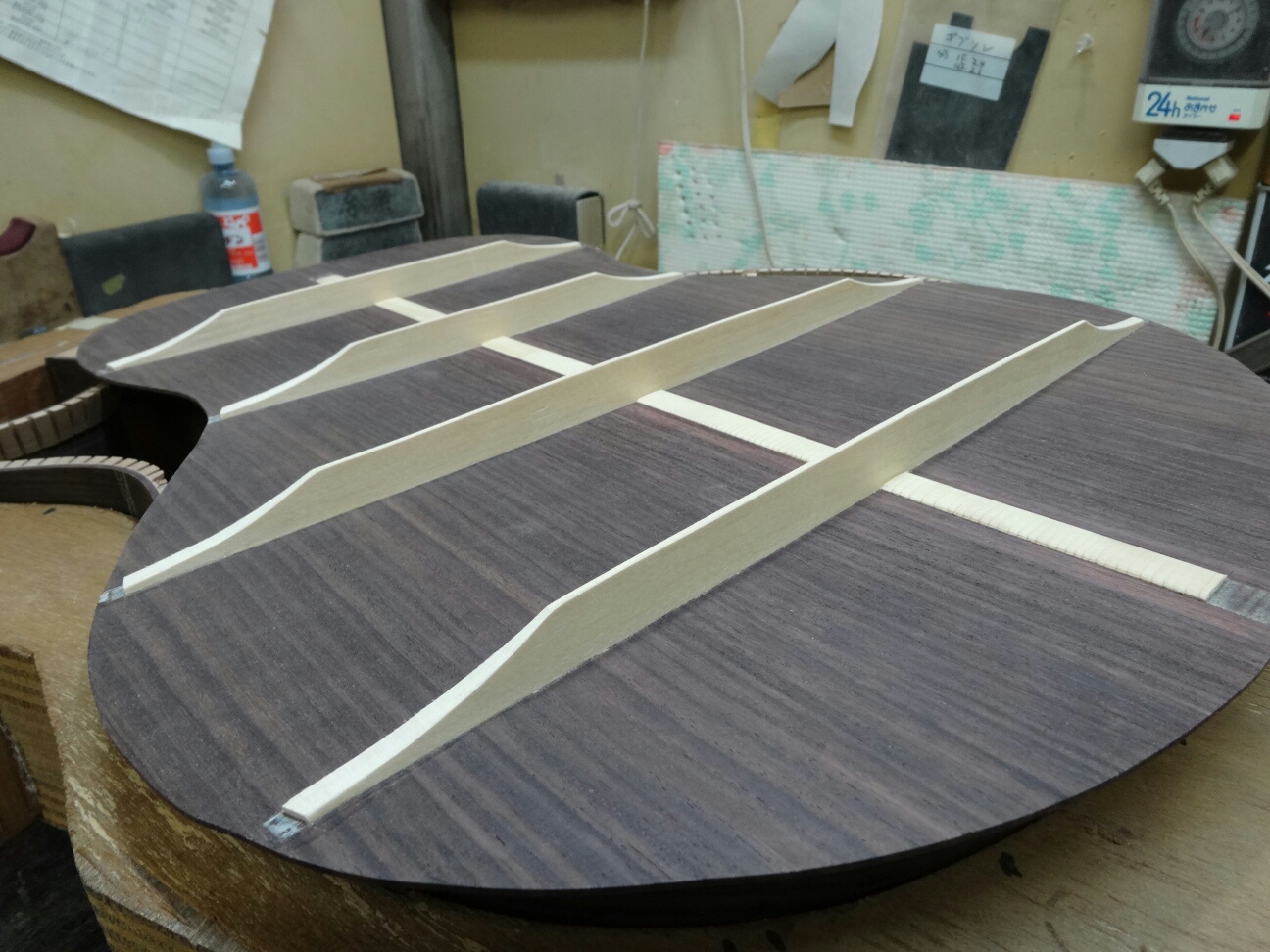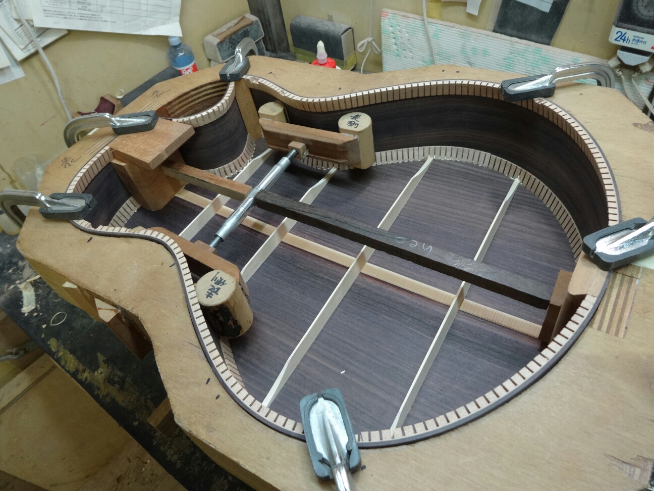 具体的に書くとブレイシングの接着には俺がやっている様なつづ棒を使って土台に押さえ付けてやる方法、シャコ万や洗濯バサミ的なクランプを使って両面から圧着する方法、最近ではゴムシートを使い真空引きして圧着する方法等があります。