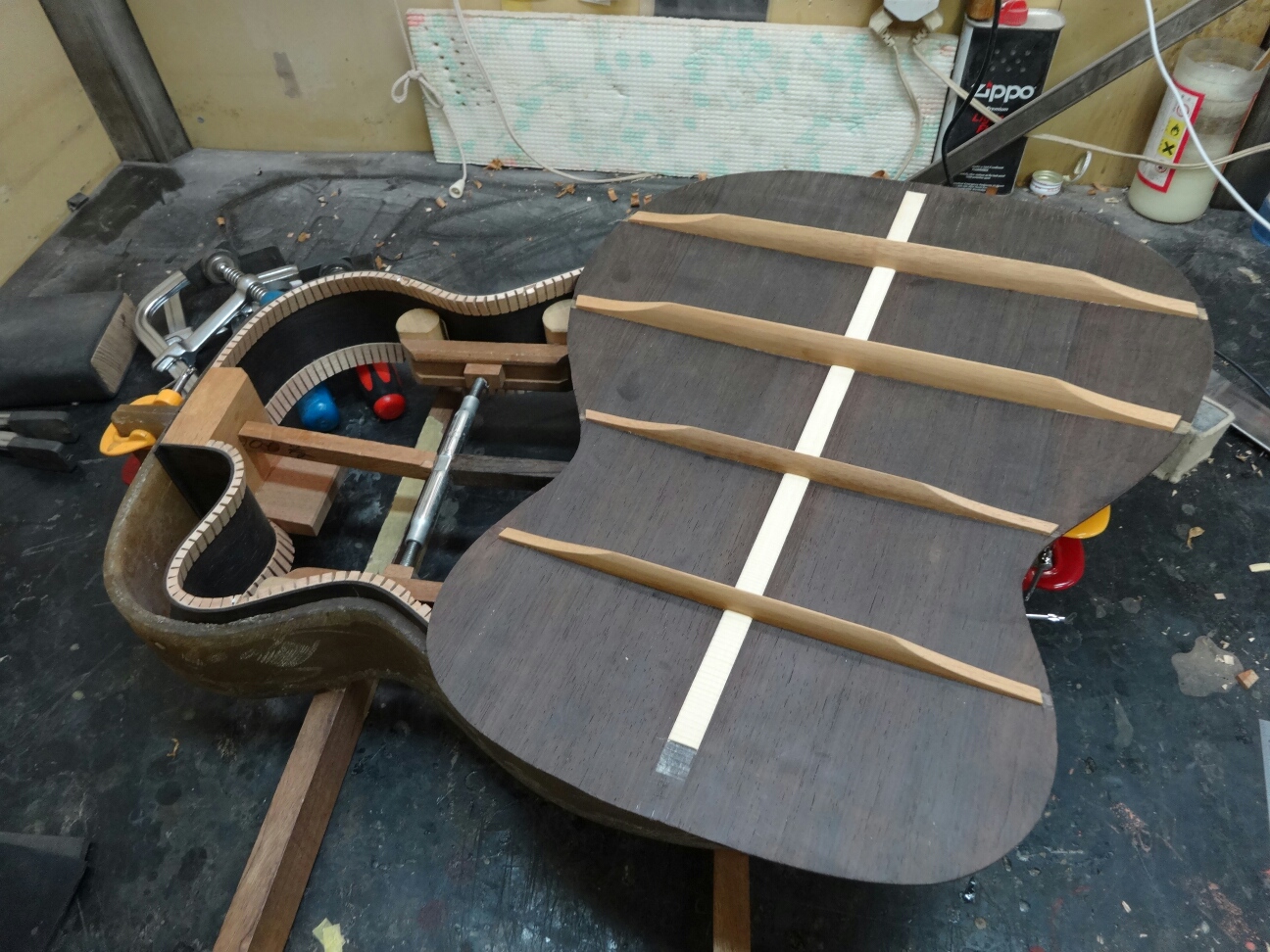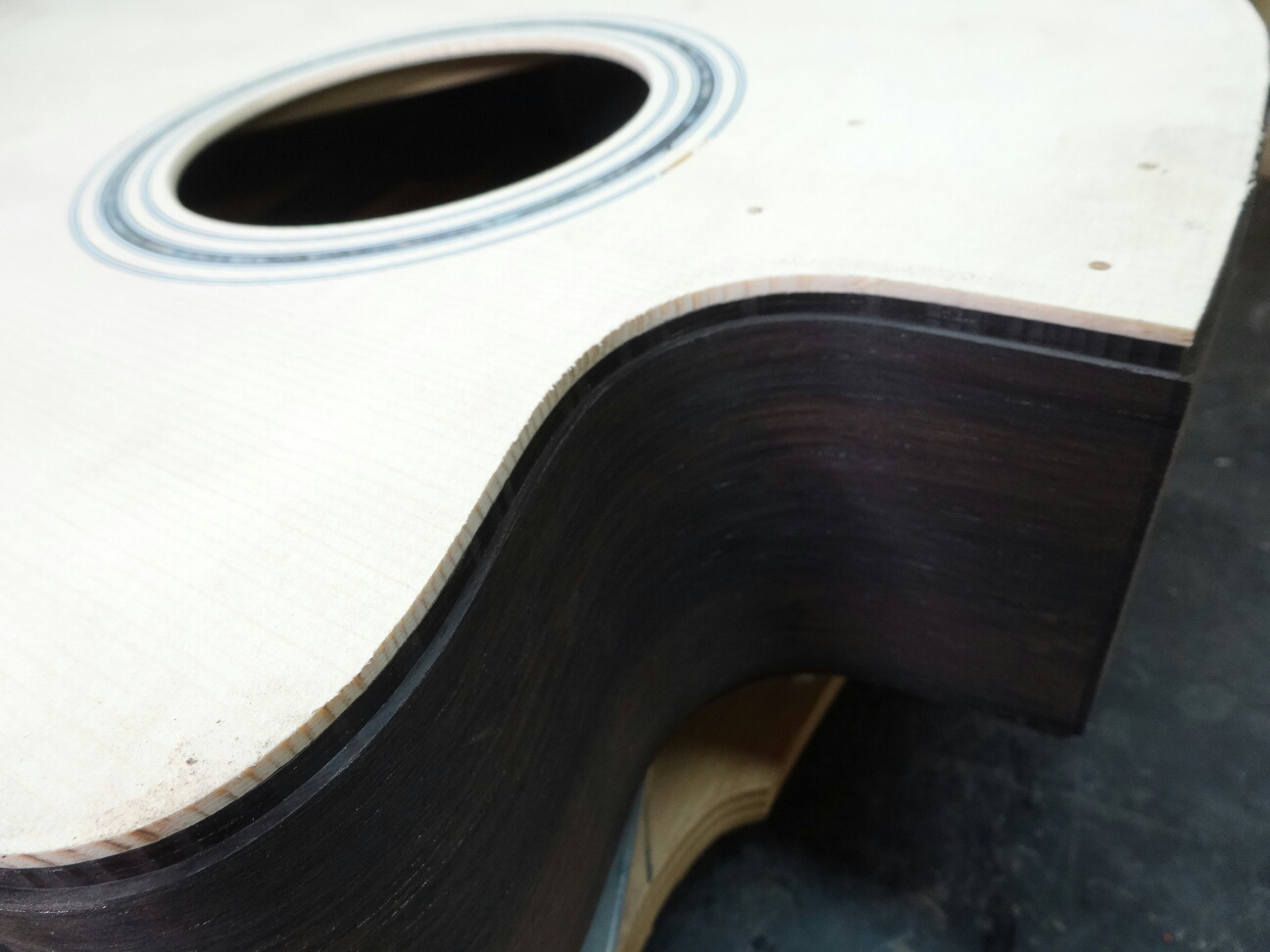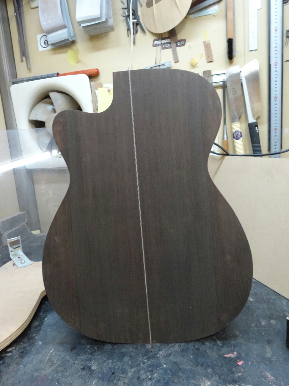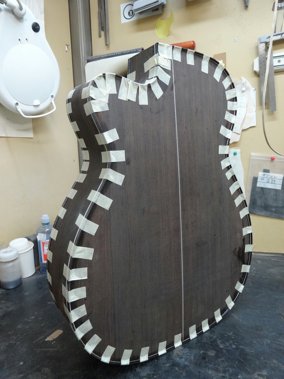 ブレイシングを接着したトップとバックをサイドと合体させてボディにします。