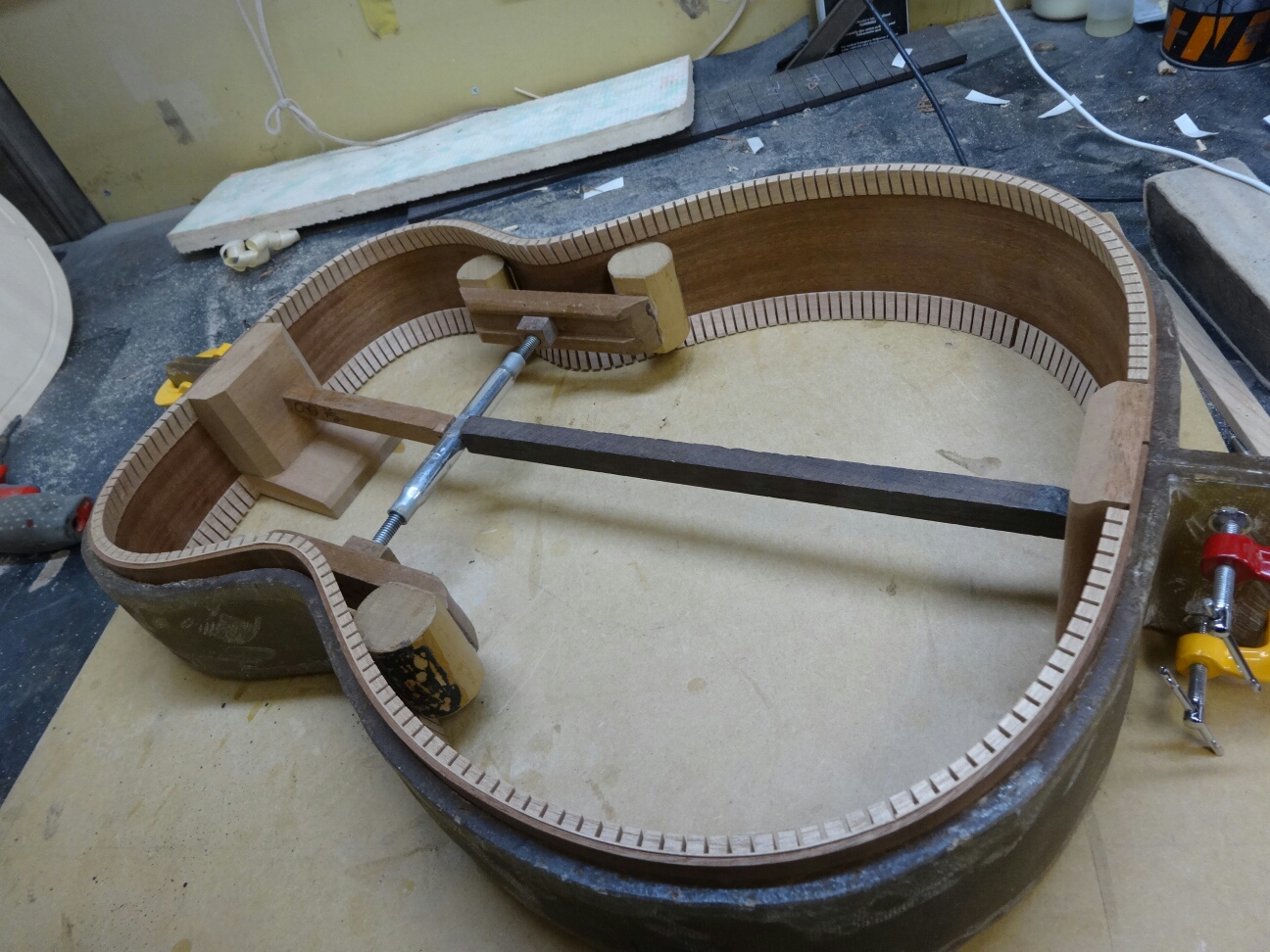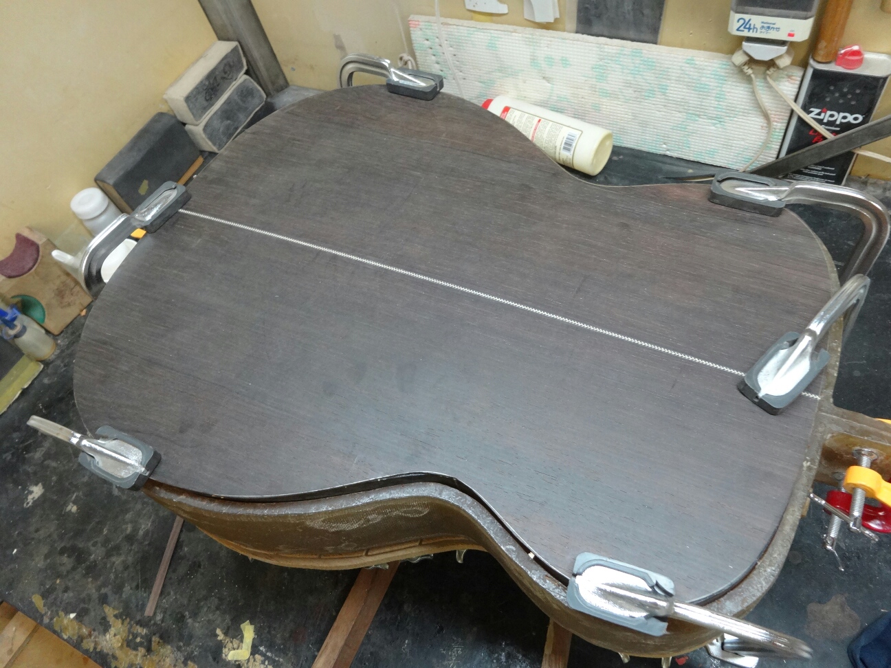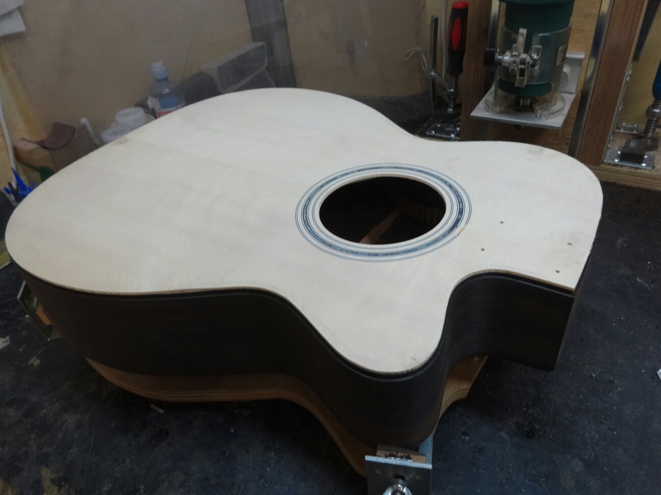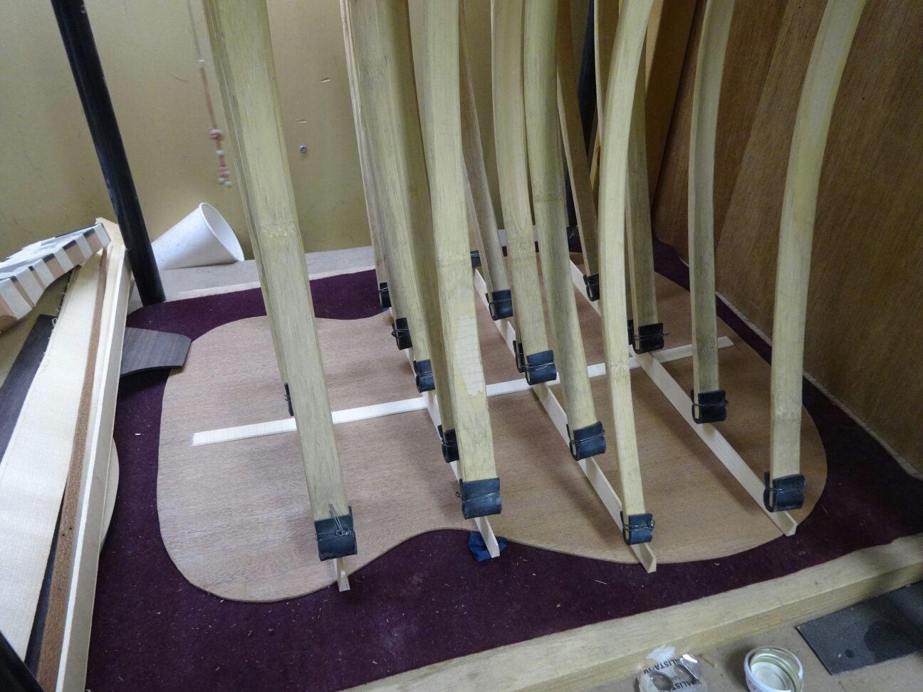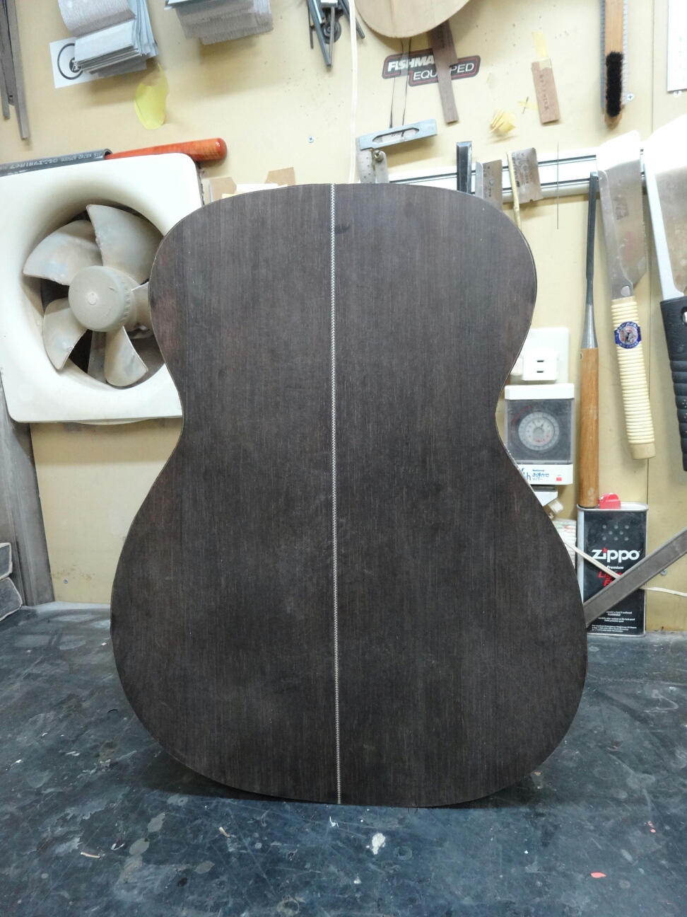 ブレイシングを接着したトップとバックをサイドと合体させてボディにします。